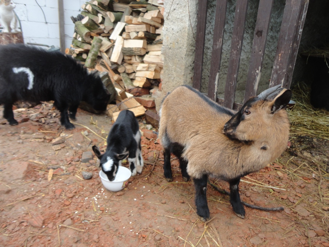 Kamerunský kozel Mates, Holandská koza Tyli (Matylda :-D) a ten malý je křiženec těchto dvou druhů (otec je ale jiný, než ten na obrázku)